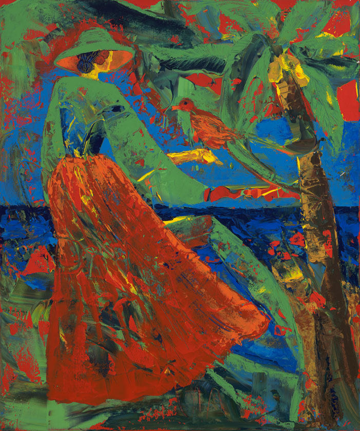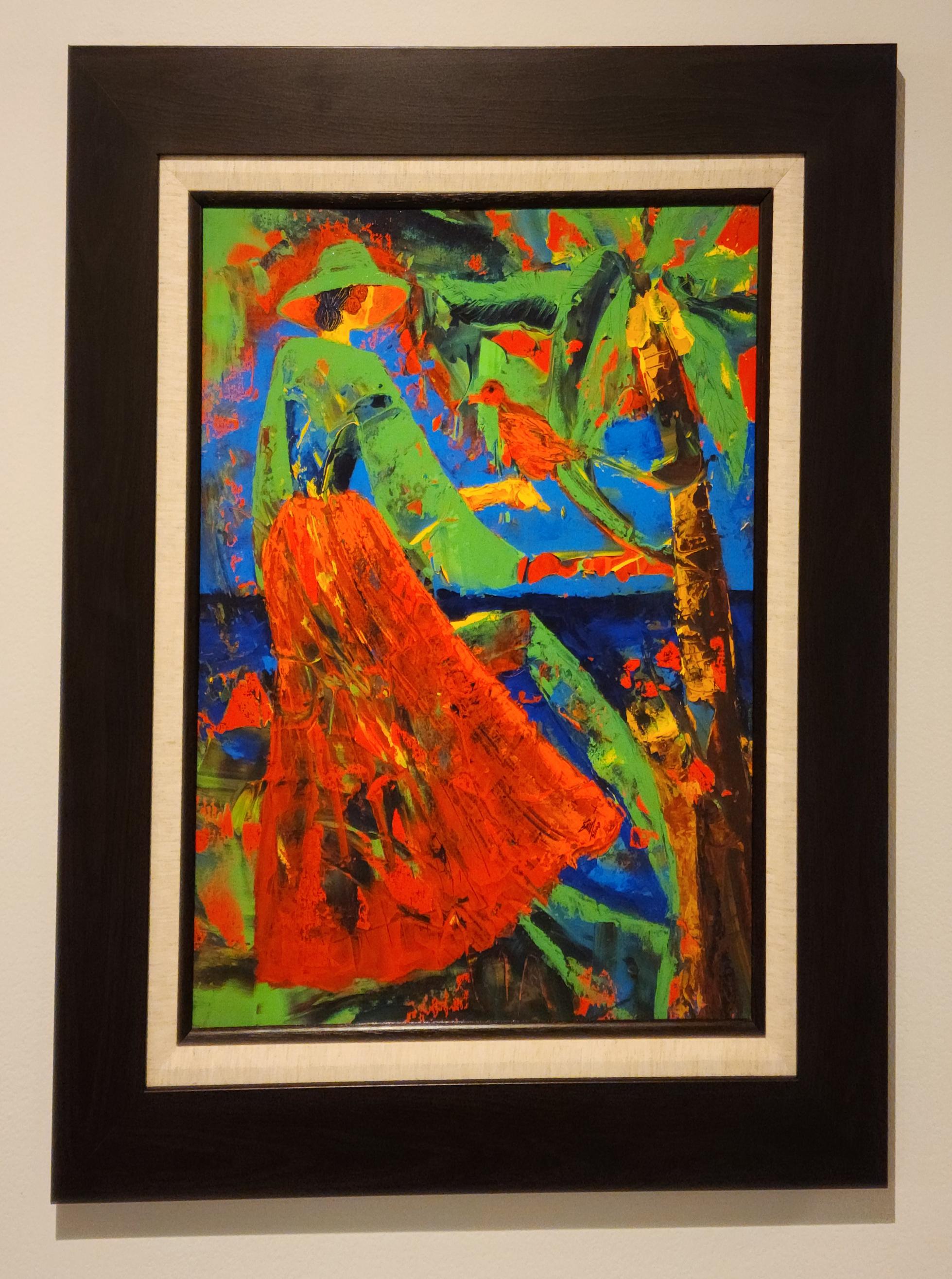 Bathed in jewel-toned hues, Lady Paradise portrays a graceful figure mid-gesture, offering her hand to a resting bird beneath a palm. The woman’s flowing skirt and wide-brimmed hat sway in harmony with the island’s vibrant energy, as strokes of emerald, sapphire, and coral swirl around her like wind and memory. Both tranquil and wild, this work speaks to quiet communion with nature—a moment suspended between beauty and wonder, painted with a palette as alive as the tropics themselves.