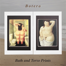 One set of two Botero prints with black mats. Fernando Botero Angulo (born 19 April 1932) is a Colombian figurative artist and sculptor. Born in Medellín, his signature style, also known as "Boterismo", depicts people and figures in large, exaggerated volume, which can represent political criticism or humor, depending on the piece. He is considered the most recognized and quoted living artist from Latin America, and his art can be found in highly visible places around the world, such as Park Avenue in New York City and the Champs-Élysées in Paris.