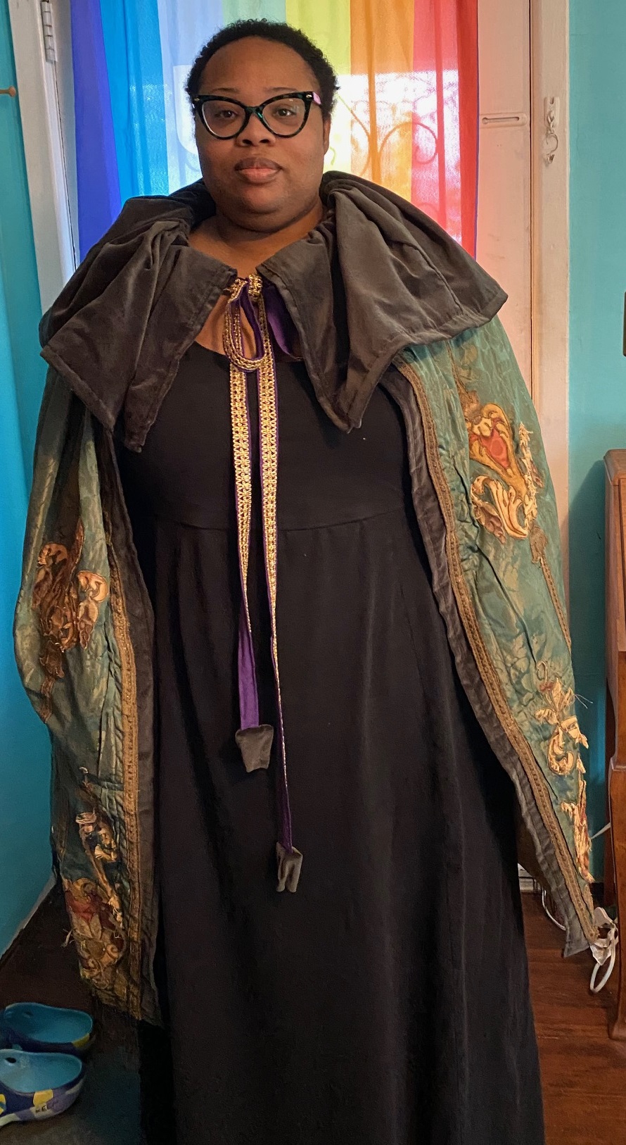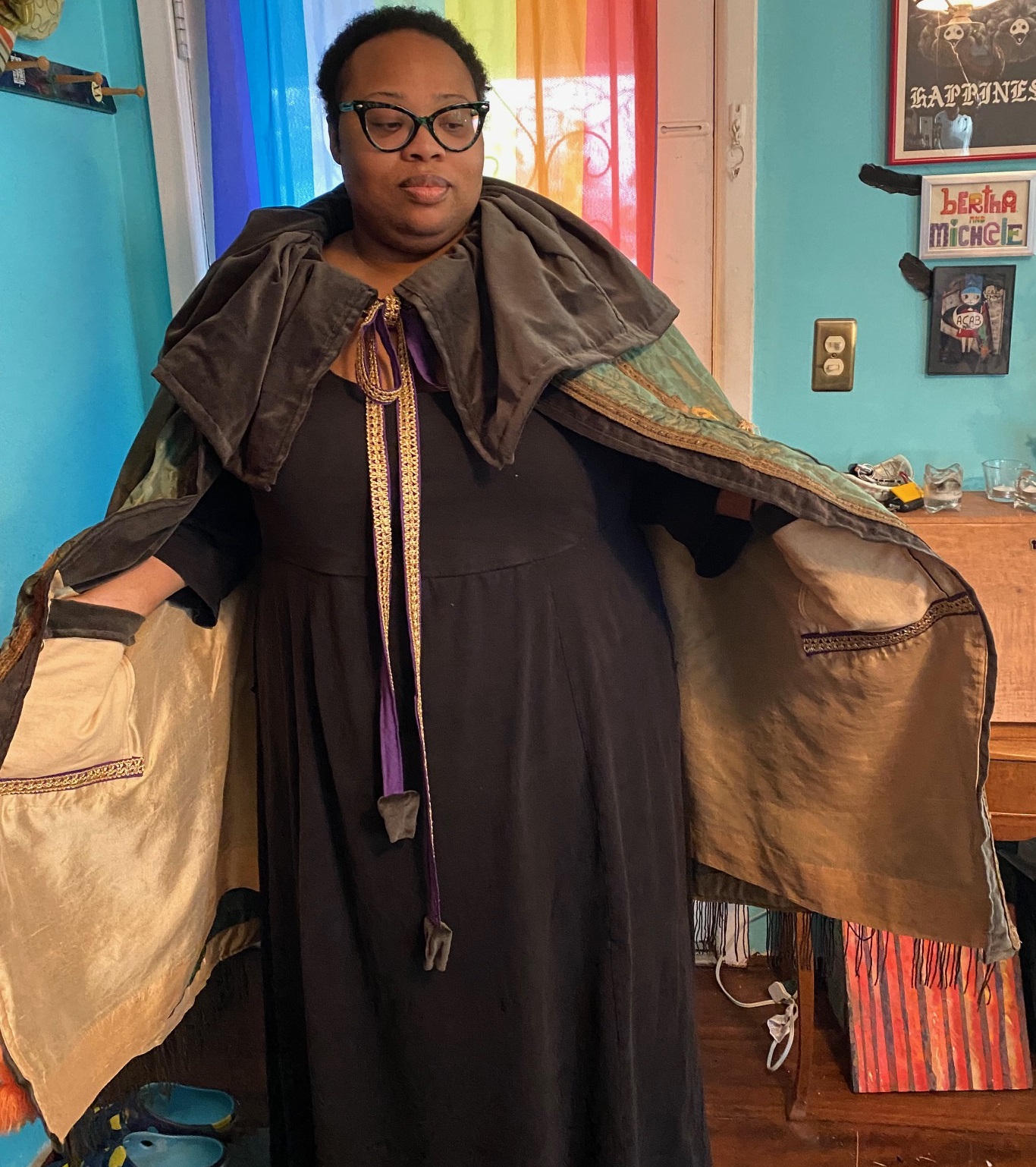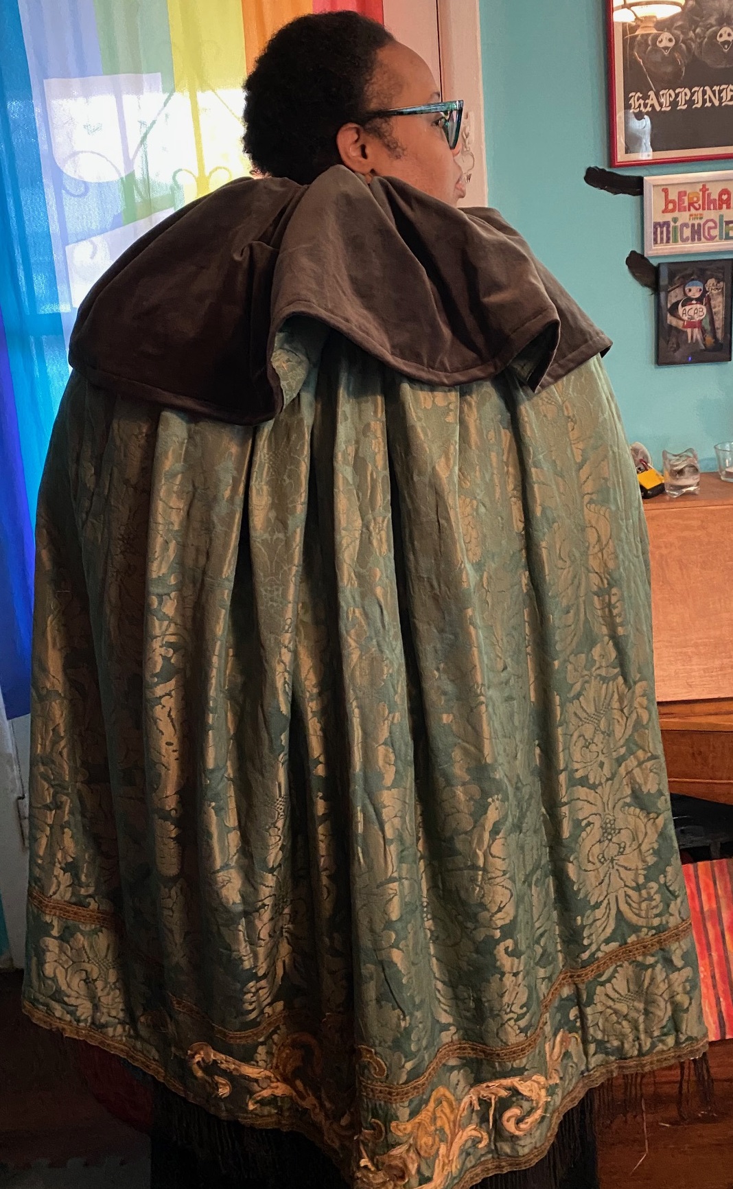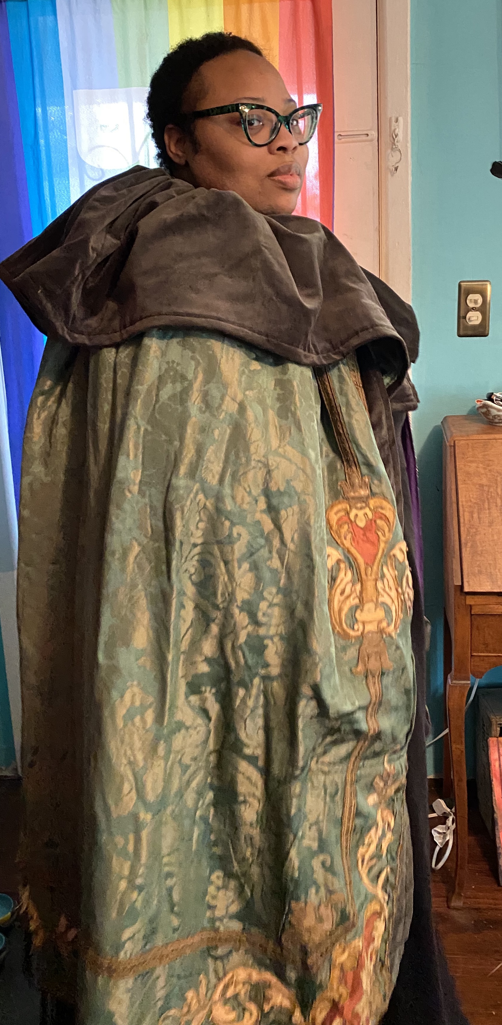 Bertha Pearl has been designing clothes for all sizes, including custom sizing, for decades. She is a fat community favorite for the passionate politics and her brilliant designs, she has merged her fat activism, love of fabric, and love of the dramatic to create bold, colorful, looks for fat people all of over the world. The winner of this auction item will become the proud owner of this Size Queen original cape made customized from a classic home fabric. Bertha says,"This gorgeously embellished fabric screamed cape to me. I wanted softness near the face so I added the velveteen, and the gold lining is also drapery fabric. Pockets are in the inside and a gilded tie finishes the look."