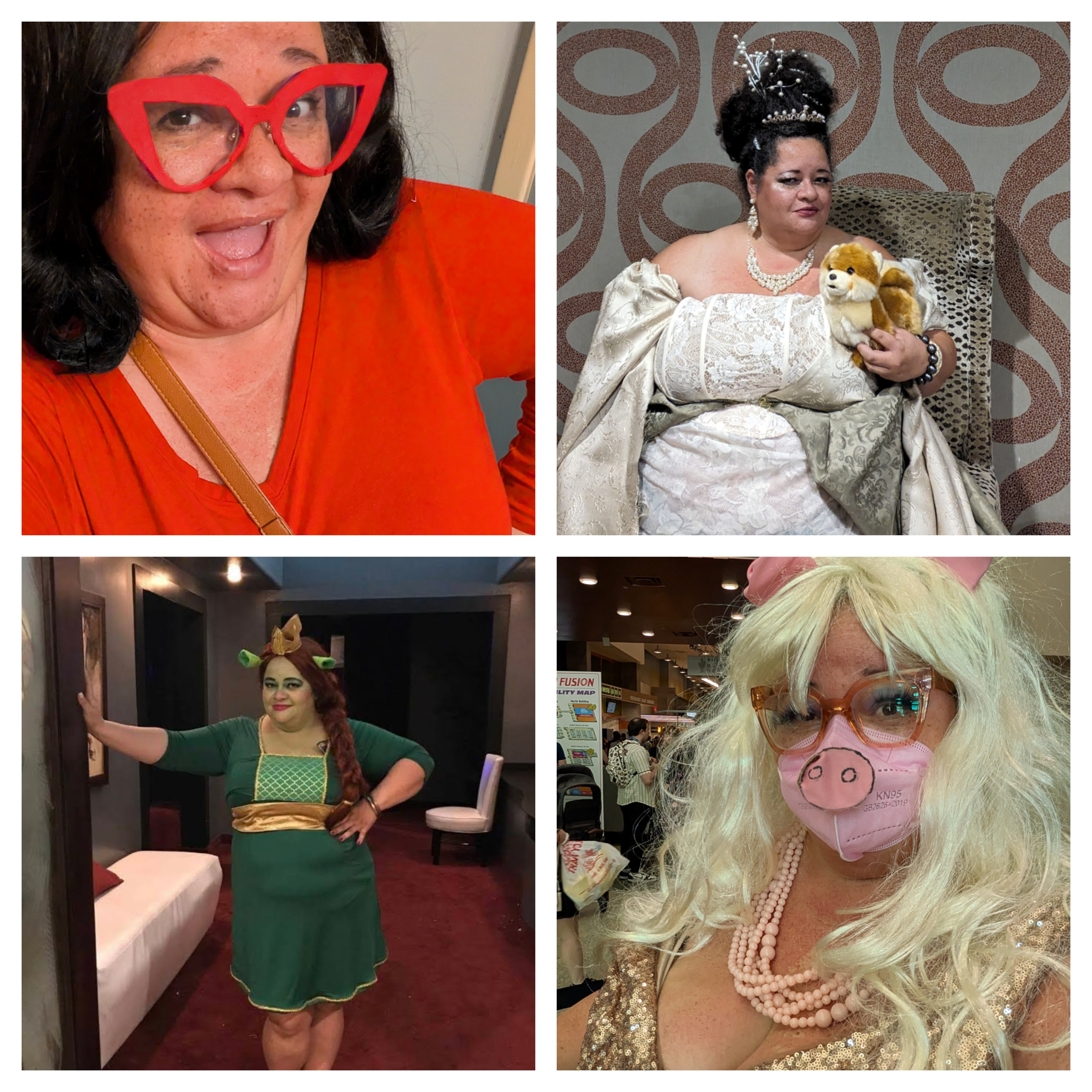 Photo description: collage of Tigress Osborn as (top row) Linda Belcher from Bob's Burgers and Queen Charlotte from Queen Charlotte/Bridgerton, (bottom row) Princess Fiona from Shrek, and Miss Piggy from everything Muppets.
