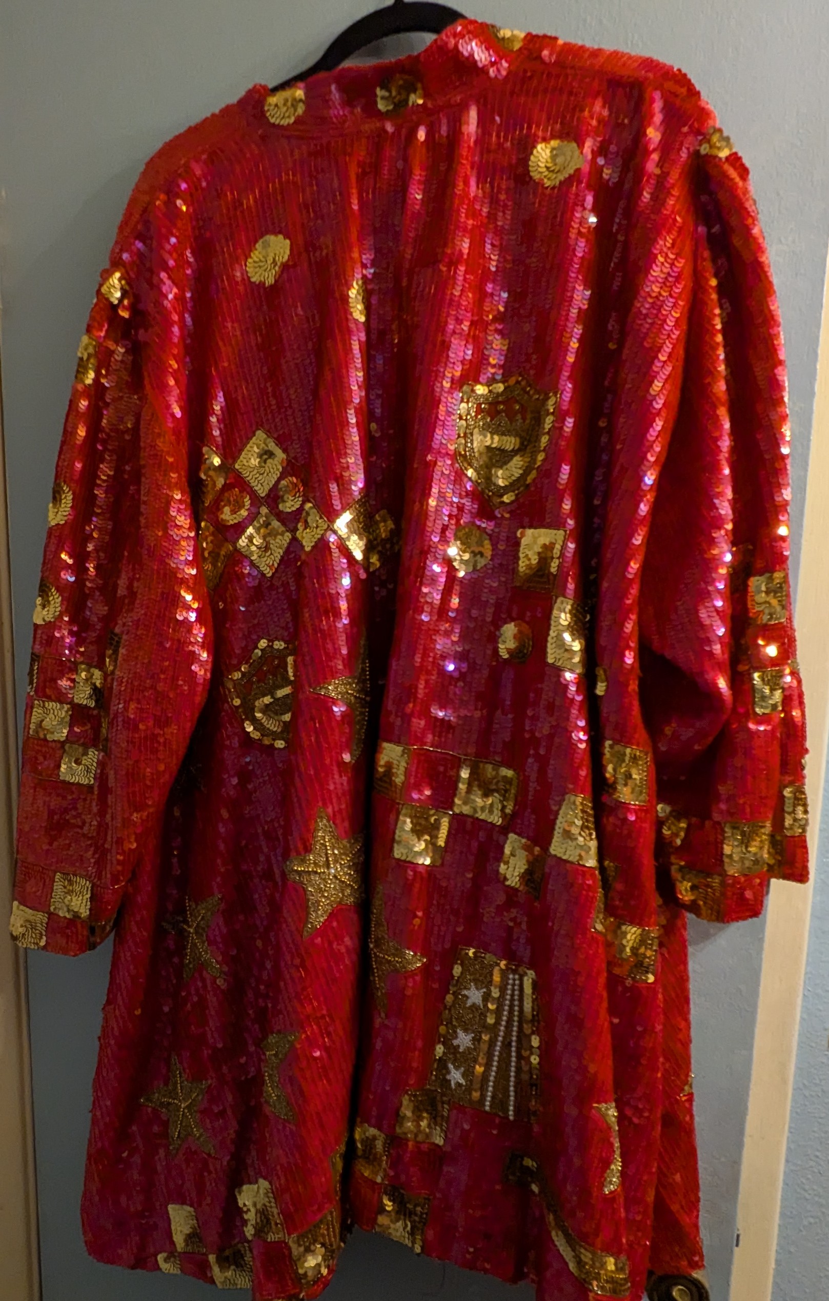 This red and gold sequined jacket is 100% rayon and made in India. The specific year purchased is undetermined, but similar jackets date to the late 80’s/early 90’s. Note: all sizing varies and vintage brands can be particularly tricky. This jacket is 38 inches long (shoulder seam to bottom). There is no size tag but we believe it to be a 5x or 6x. It can be worn open or closed, and it measures about 34 inches across the back from underarm to underarm.