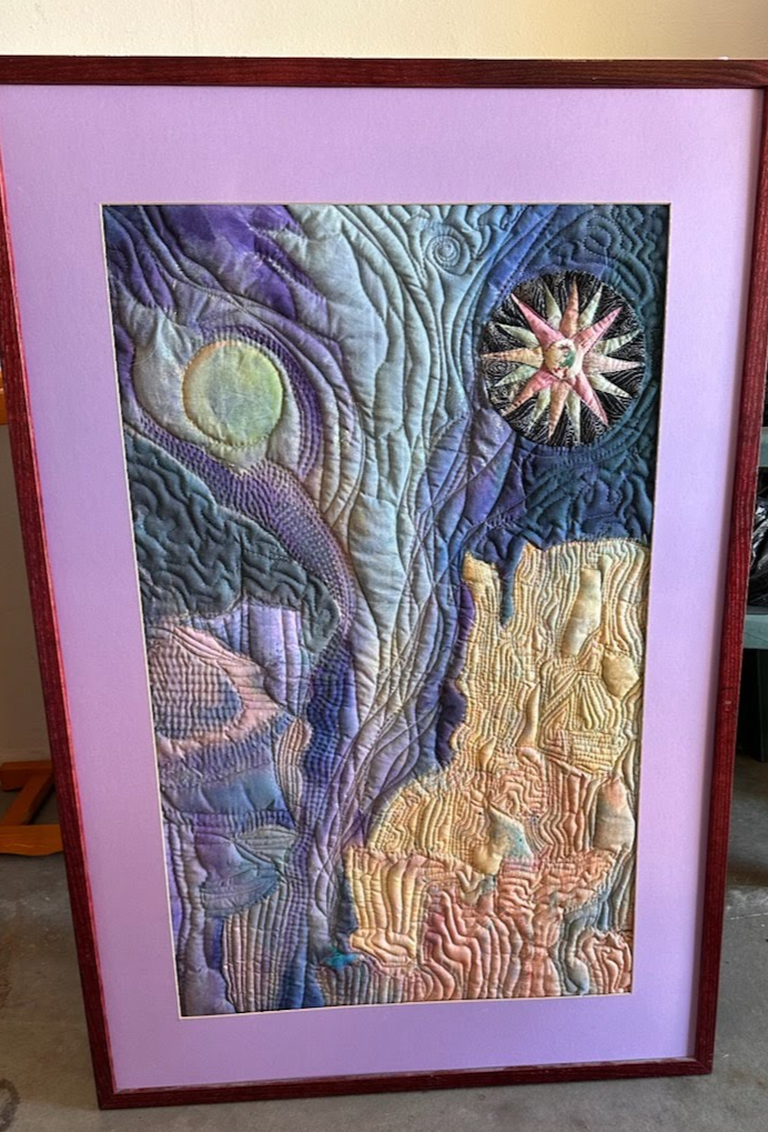 A 37" x 25" framed multicolor quilt wall hanging featuring a sun, moon, and mountain design.